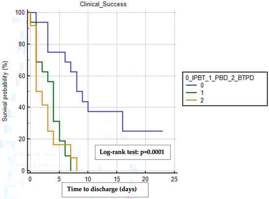 Similarly, the BTPD group had the shortest median time to discharge (1 day, 95% CI 1–3) compared to the PBD group (4 days, 95% CI 1–5) and the IPTB group (8 days, 95% CI 6–16), with a statistically significant difference observed (log–rank test p = 0.0001) (Figure 2).