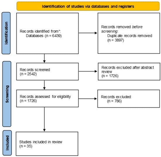 Literature research was conducted using PubMed and Google Scholar databases from 2014 onwards. The keywords used for database interrogations were as follows: microbiota; breast cancer; tumor microenvironment (TME); bacterial taxa; metabolic reprogramming of microbiota; host–microbiota interactions; microbial signatures; microbial dysbiosis; cancer proliferation; cancer metastasis; drug resistance; immune escape; diagnostic biomarkers; prognostic biomarkers; therapeutic targets; immunotherapy. A total of 6439 publications were found. The search results were reviewed, with the inclusion criteria of studies placing emphasis on breast cancer tissue resident microbiotas, microbial dysbiosis in breast cancer, specific microbial signatures in breast cancer, a correlation between breast microbiotas and cancer development, and the potential of microbiotas as diagnostic and prognostic biomarkers in breast cancer. Three of the authors independently selected potential articles for inclusion based on the title, with further refinement of the selection process based on abstract review. Following the PRISMA guidelines, after the exclusion of duplicates, the abstract review for suitability, and finally the full-text analysis of the remaining papers, a total number of 35 articles were selected for inclusion in the present review, as can be observed in the flow diagram (Figure 1). This study was not registered.