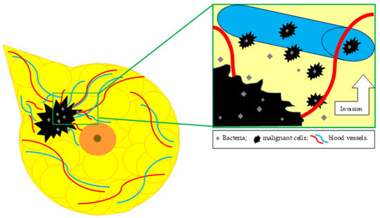 As exemplified before, breast microbiotas can have either a protective role against cancer proliferation or an inductive role in tumor cell multiplication [43]. In terms of the influence exerted by microbiotas on cancer metastasis, Fu et al. showed that malignant cells transported bacteria from the primary tumor to the site of the metastasis, as illustrated in Figure 2. Using a 16s rRNA sequencing technique, various tissues were analyzed: the primary breast tumor, normal breast tissue, normal lung tissue, metastasis-adjacent lung with early micro-metastasis, and lung macro-metastasis. It was observed that the breast tumor microbiota resembled the microbiota found in the metastasis-adjacent lung but was completely different from the one found in the normal breast tissue or in the normal lung tissue. The microbiota discovered in the lung macro-metastasis had characteristics from both breast tumor tissue and normal tissues. Further analysis revealed that aerobic types of bacteria were expanding in the lung metastasis, while the amount of facultative anaerobic microorganisms was diminishing [18].