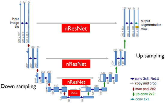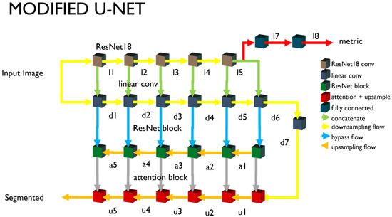 - Ronneberger, O.; Fischer, P.; Brox, T. U-net: Convolutional networks for biomedical image segmentation. In Proceedings of the Medical Image Computing and Computer-Assisted Intervention–MICCAI 2015: 18th International Conference, Munich, Germany, 5–9 October 2015; pp. 234–241. [Google Scholar]