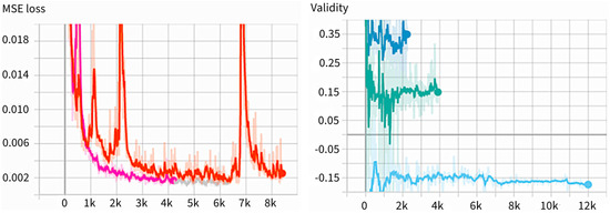 Example of Tensorboard output in MSE Loss (left) and validity (right). In validity, different colors indicate different versions of validity, showing training is discontinued and resumed.