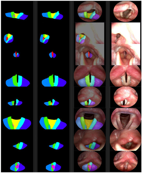 The dataset received from the host agency in September was separated by 4136:1035 in training and testing, and a total of 5171 labeled images were used for the pilot studies. The labeling was defined as the four larynxual structures of R-TVC, L-TVC, R-FVC, and L-FVC, as well as the three lesion classes of Subglottis, Benign Tumor, and Cancer. The dataset delivered from the host organization on 26 November 2021 was separated into 2700:300 in training and evaluation and used as additional data in this study. In this study, we used the datasets labeled with polygons with seven colors. The ground truth data were labeled by using the H value in the HSV color space based on the color table with the seven colors, as shown in Table 1.