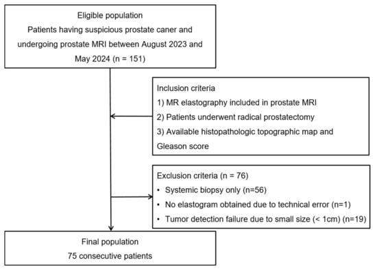 A total of 151 patients who had suspected PCa and underwent prostate MRI between August 2023 and May 2024 were initially eligible for this study. Patients who satisfied the following inclusion criteria were selected: (1) patients who underwent MRE; (2) patients who underwent subsequent robot-assisted laparoscopic radical prostatectomy; (3) patients who had histopathologic whole mount and relevant full pathologic information including GS. From this population, 56 patients who had undergone systematic biopsy only were excluded. In addition, 19 patients whose tumor size was less than 1 cm were excluded due to the inherent limitations of MRE in detecting small tumors. One patient was excluded due to technical errors during MRE. Finally, 75 patients (mean age, 70; range, 56–86) were included and analyzed. The patient accrual process is presented in Figure 1.