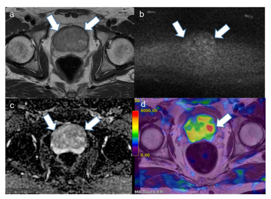 Recent advances in MRI include techniques such as diffusion, perfusion, and texture for acquisition of the physical properties of specific tissues [5,6,7]. Magnetic resonance elastography (MRE) is an emerging technique for measuring liver stiffness and has shown promising results for staging liver fibrosis [8,9,10]. Moreover, the prostate gland is one of the organs other than the liver in which MRE could be implemented, considering the previous observation that PCa causes the prostate to have a higher stiffness value than the normal prostate gland [11,12,13].