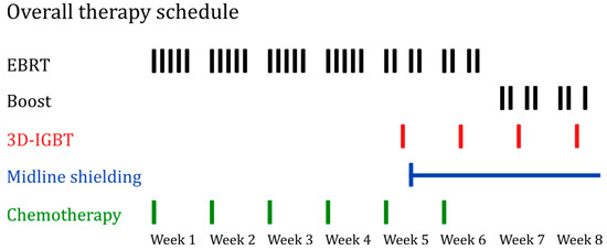 Overall therapy schedule, with each line representing a fraction. EBRT (black) with 28 fractions of 1.8 Gy, totaling 50.4 Gy. A potential boost could extend the dose to 63 Gy. Midline shielding (blue) starts at 39.6 Gy. Four fractions of IGBT (red) are administered (under midline shielding EBRT) with 6 Gy each, for a total dose of 24 Gy. No EBRT fractions were applied on the days of brachytherapy. Chemotherapy (green) was administered 5 to 6 times in total, once per week, with a cisplatin dose of 40 mg/m2 BSA. Abbreviations: EBRT, external beam radiotherapy; 3D-IGBT, 3D-image guided brachytherapy.