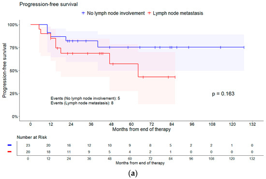 About lymph node status, the chance for having a complete remission decreased with pelvic lymph node involvement (OR = 0.38, 95% CI [0.06, 2.29], p = 0.292) and para-aortic lymph node metastasis (OR = 0.32, 95% CI [0.06, 1.74], p = 0.188) compared to no lymph node involvement. Furthermore, as displayed in Table 2, especially patients with para-aortic lymph node metastasis have an increased risk of experiencing an event related to PFS compared to those with no lymph node involvement (HR = 3.04, 95% CI [0.86, 10.76], p = 0.192). In addition, patients with para-aortic lymph node metastasis had a worse PFS compared to patients with pelvic lymph node metastasis (HR = 2.48, 95% CI [0.78, 7.92], p = 0.192). This is displayed in the Kaplan–Meier plots with the log-rank test in Figure 2.