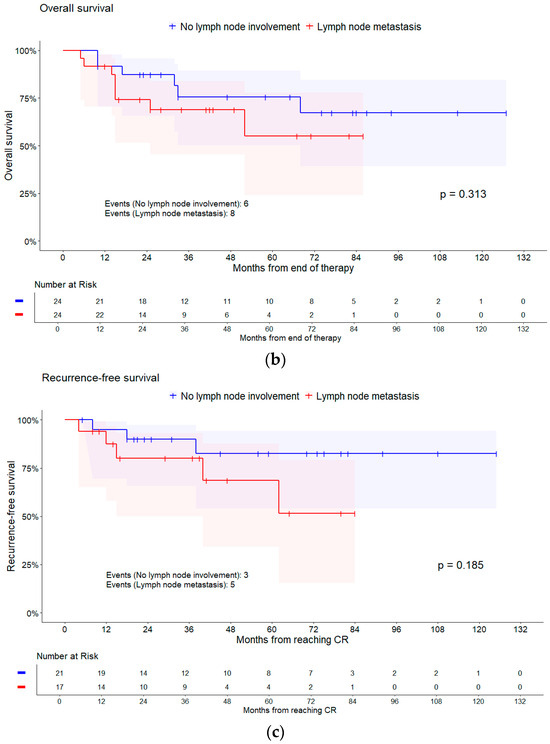 Kaplan–Meier curves of different survival times for lymph node involvement. Shaded areas represent pointwise 95% CI (log–log transformation). p-values are from log-rank tests. (a) Progression-free survival; (b) overall survival; and (c) recurrence-free survival.
