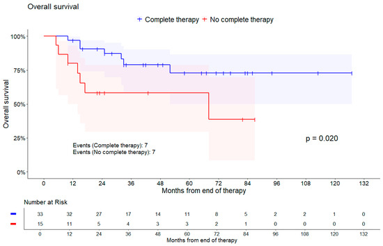 Patients with incomplete therapy had a higher risk of death (HR = 3.27, 95% CI [1.13, 9.42], p = 0.020). Figure 3 represents the Kaplan–Meier plot for this outcome. Incomplete therapy was also associated with lower RFS, (HR = 2.16, 95% CI [0.51, 9.11], p = 0.284), but not with PFS (HR = 1.07, 95% CI [0.29, 3.91], p = 0.921). Additionally, the chance for having a complete remission decreased with no complete therapy (OR = 0.61, 95% CI [0.14, 2.60], p = 0.505). A tendency towards a higher chance of achieving a complete remission was observed in patients with an additional EBRT boost (OR = 1.87, 95% CI [0.44, 8.01], p = 0.401).