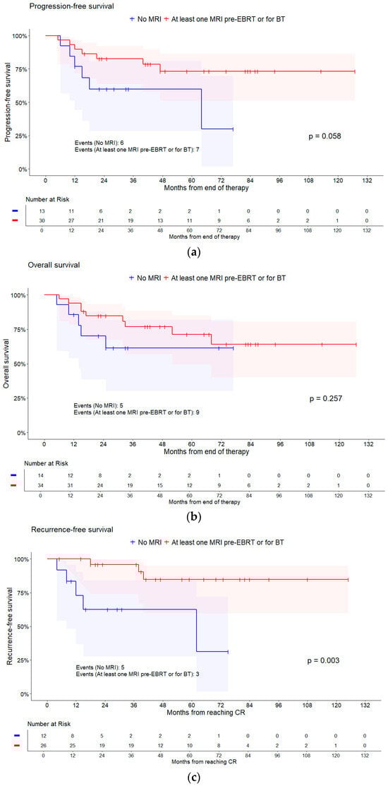 Focusing on MRI scans performed, the hazard of an event tended to be lower for PFS (HR = 0.36, 95% CI [0.12, 1.09], p = 0.058), RFS (HR = 0.14, 95% CI [0.03, 0.61], p = 0.003), and OS (HR = 0.54, 95% CI [0.18, 1.62], p = 0.257), i.e., all survival times tended to be better, if an MRI was performed. The same trend shows when differentiating between no or at least one MRI for any brachytherapy application for OS and RFS, as shown in Table 3 and Table 4. No influence on PFS regarding the performance on MRI scans could be observed, as results in Table 2 indicate. Kaplan–Meier curves are shown in Figure 4.