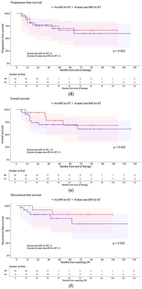 Kaplan–Meier curves of different survival times for having any MRI and for having an MRI for brachytherapy (BT). Shaded areas represent pointwise 95% CI (log–log transformation). p-values are from log-rank tests. (a) PFS for MRI; (b) OS for MRI; (c) RFS for MRI; (d) PFS for MRI BT; (e) OS for MRI BT; and (f) RFS for MRI BT.
