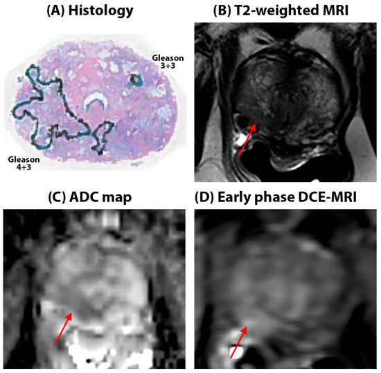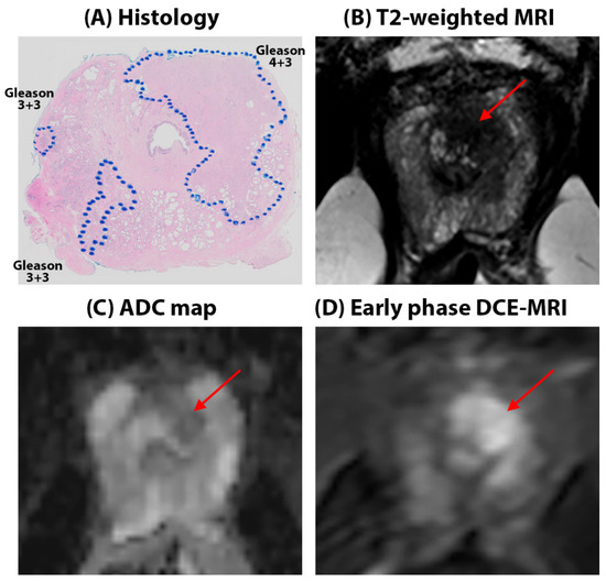 52-year-old Caucasian American patient with Gleason 3 + 4 cancer in the right apex in the peripheral zone (red arrows on mpMRI). The lesion is seen as a hypo-intense region on the T2W image, T2 (112.4 ± 54.6 ms), and mildly hypo-intense on ADC (0.86 ± 0.12 µm2/ms) maps with only diffuse early enhancement on DCE-MRI, evidenced by low signal enhancement rate (3.50 s−1) and washout rate (0.03 s−1). Surrounding benign tissue in the peripheral zone had ADC = 1.16 ± 0.19 µm2/ms, T2 = 125.1 ± 34.5 ms, α = 3.20 s−1, and β = 0.01 s−1. Cancers are outlined in blue on histology sections.