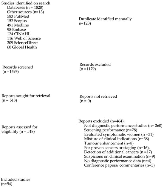 The literature search resulted in 1820 studies; 123 of these studies were duplicates. Following screening of title and abstract, 1179 were excluded, and 518 studies were considered appropriate for full-text review. After applying the inclusion and exclusion criteria, 464 of these 518 studies were excluded due to the following reasons: did not assess the diagnostic performance of imaging modalities (n = 260), assessed the performance of these imaging modalities for screening of asymptomatic women (n = 78), diagnostic evaluation of symptomatic women who had not undergone screening (n = 31), were for a mixture of different clinical indications (n = 38), assessed tumour enhancement only (n = 8), or focused on the detection of histologically proven cancers (n = 9) or staging of breast lesions (n = 7). Other reasons for exclusion were the following: detection of contralateral cancer or additional cancer not detected at screening (17), suspicious lesions at clinical breast examination (n = 9), did not provide diagnostic performance data (n = 4), or were conference papers and commentaries (n = 3). A total of 41 studies were considered eligible for inclusion. Thirteen additional studies were identified through Google search and reference lists of eligible articles. A PRISMA flowchart showing the excluded studies and reasons for exclusion is shown in Figure 1. Most of the studies reviewed included two or more imaging modalities.