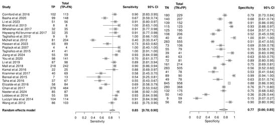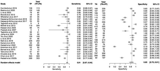 Forest plot illustrating the pooled sensitivity and specificity of DM in recalled lesions [12,13,14,15,16,17,18,19,25,26,27,28,29,31,32,33,34,35,36,37,38,39,40,41,42].