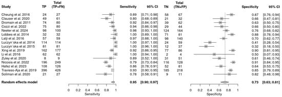 Seventeen studies reported the performance of CEM in discriminating recalled lesions. Of these, the threshold for assessing performance or reporting of diagnostic performance was unclear in one study and was excluded from the meta-analysis. The remaining 16 studies reported sensitivity values ranging from 78 (95% CI: 58–91) to 100 (95% CI: 89 –100) and specificity ranging from 32 (95% CI: 18–50) to 91 (95% CI: 84–95). The pooled sensitivity was 95 (95% CI: 90–97%) and specificity was 73 (95% CI: 63–81) as shown in Figure 5. The I2 statistics demonstrated substantial heterogeneity in sensitivity (I2 = 72) and specificity (I2 = 88). No publication bias was detected (p = 0.72). The findings indicate that CEM is an efficient imaging modality for the assessment of recalled lesions.