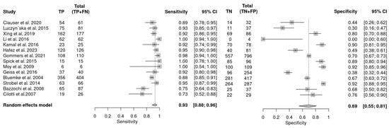 Forest plot illustrating the pooled sensitivity and specificity of CEM in recalled lesions [20,40,41,42,50,51,53,54,55,56,57,58,59,60,61,62].