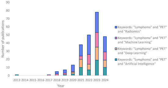 To conduct this review, we undertook a comprehensive exploration of the PubMed database using a diverse set of search phrases and keywords. These search terms included ‘lymphoma’, ‘artificial intelligence’, machine learning’, ‘radiomics’, ‘deep learning’, and ‘radiogenomics’. Our search covered content from the year 2000 to 20 August 2024. We used the Boolean operators ‘AND’ and ‘OR’ to combine the main terms and keywords, refining the search results. Publications covering a wide range of diseases, conference papers, literature reviews, and articles in non-English languages were excluded using specific criteria to narrow down our study selection. A limitation of this study is the use of a single database (PubMed) for the bibliography search, which may have limited the inclusion of studies available in other databases. It is important to note that a limitation of this study is the use of a single database (PubMed) for the bibliography search, which may have limited the inclusion of studies available in other databases.