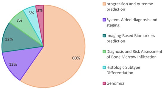 As expected, the number of studies using radiomics and/or AI has significantly risen since 2020, and the keywords ‘Lymphoma’, ‘PET’, and ‘Radiomics’ together seem to lead to more relevant results (Figure 1). In the subsequent step, we meticulously categorized the studies into five distinct sections, as visually represented in Figure 2. The majority of studies were related to the topics of “progression and outcome prediction.” In contrast, genomics studies comprised the smallest share of the research.