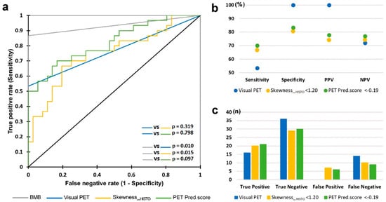 ROC curves for BMI diagnosis through BMB, visual PET, skewness_HISTO PET, and pred.score PET evaluations. (a) Comparative ROC curves; (b) evaluation of sensitivity, specificity, PPV, and NPV; (c) rates of true positives, true negatives, false positives, and false negatives. Reprinted with permission from [26] under a Creative Commons Attribution 4.0 International License.
