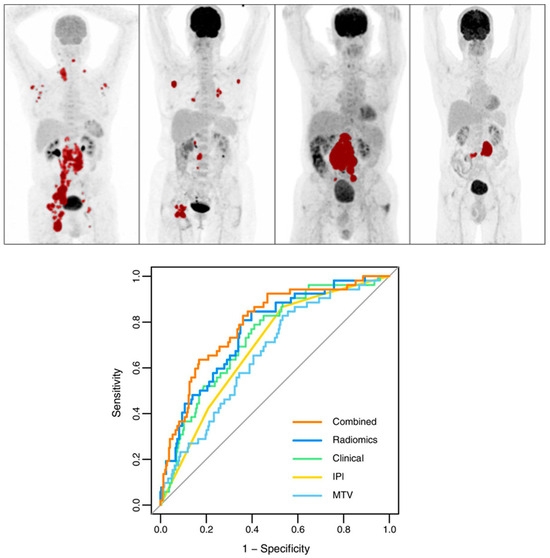 Top panel: Maximum intensity projections showcasing patients categorized by MTV and dissemination levels. Tumors are marked in red. Sequence from left to right: high MTV with high dissemination, low MTV with high dissemination, high MTV with low dissemination, and low MTV with low dissemination. Bottom panel: Receiver operating characteristic curves for the 2-year progression timeframe based on IPI, best clinical approach, MTV, the top radiomics model, and combined prediction models. Modified and reprinted with permission from [71] under a Creative Commons Attribution 4.0 International License.
