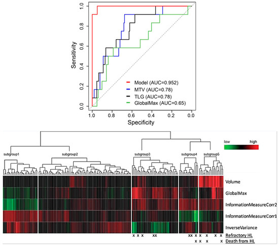Top panel: Receiver Operating Curves showcasing the performance of models incorporating five radiomic characteristics (in red), metabolic tumor volume (in blue), total lesion glycolysis (in black), and GlobalMax (SUVmax, represented in green) for the patient group with mediastinal conditions. Bottom panel: Heatmap illustrating the prognostic categories derived from the top five mediastinal radiomic predictors. Modified and reprinted with permission from [74] under a Creative Commons Attribution 4.0 International License.