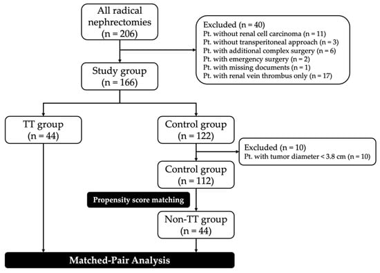From the initial group, we excluded some individual cases, such as those without transperitoneal access or those with additional complex surgery, since these circumstances may have affected the outcome of surgery (Figure 1). As the smallest diameter of a tumor in the TT group was 3.8 cm, we excluded 10 cases in the control group with a smaller tumor diameter. For each of the 44 patients with TT in the IVC (TT group), 1 patient was propensity score-matched from the remaining 112 patients without TT (control group), creating a non-TT group (n = 44). All study data were recorded in accordance with the local ethics committee requirements.
