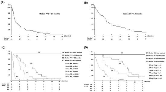 The median PFS and OS of all patients were 2.6 and 8.1 months, respectively (Figure 1A,B). Furthermore, survival was evaluated according to clinical tumor response. Two patients maintained CR without tumor progression for more than 45 months after initiating nivolumab therapy. The median PFS of patients with PR, SD and PD were 10.3, 6.5, and 1.7 months, respectively (CR vs. PR, p = 0.02; CR vs. SD, p = 0.01; CR vs. PD, p = 0.01; PR vs. SD, p = 0.02; PR vs. PD, p < 0.001; SD vs. PD, p < 0.001; Figure 1C). The median OS of patients with PR, SD, and PD were 24.7, 12.0, and 3.8 months, respectively (CR vs. PR, p = 0.04; CR vs. SD, p = 0.04; CR vs. PD, p = 0.01; PR vs. SD, p = 0.11; PR vs. PD, p < 0.001; SD vs. PD, p < 0.001; Figure 1D).