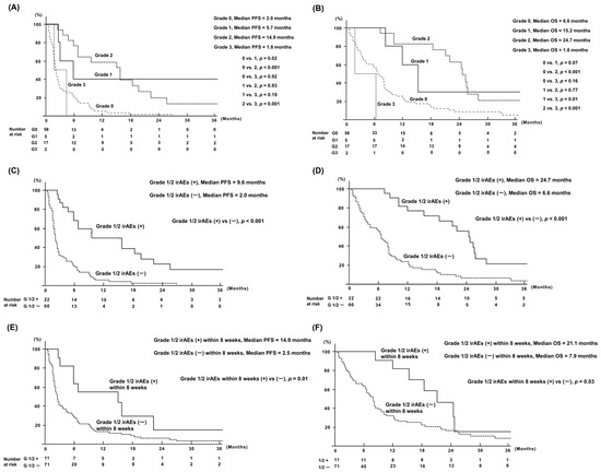 Furthermore, we evaluated the differences in survival between patients with and without grade1/2 irAEs within 8 weeks (n = 11 and n = 71, respectively) to assess the association between early-period irAEs and survival outcomes. The median PFS of patients with and without grade1/2 irAEs within 8 weeks were 14.9 and 2.5 months, respectively (p = 0.01; Figure 2E). The median OS of patients with and without grade1/2 irAEs within 8 weeks were 21.1 and 7.9 months, respectively (p = 0.03; Figure 2F). PFS and OS differed significantly between patients with and without grade1/2 irAEs within 8 weeks.