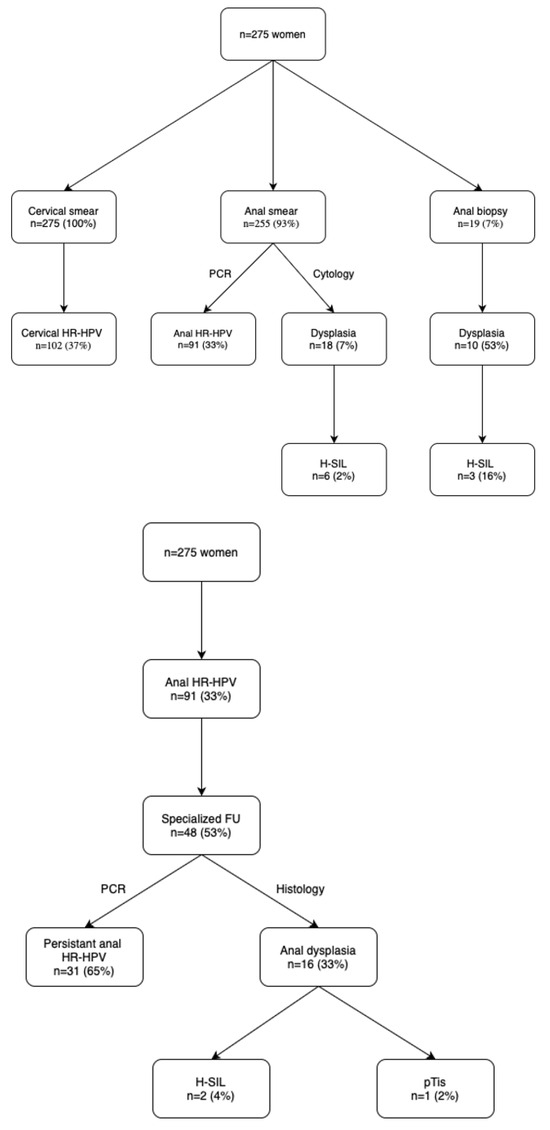 This is a follow-up study of the AnusGynecology (ANGY) prospective cross-sectional single-center study (SNCTP000002567) [15]. In total, 275 women were recruited at the Lausanne University Hospital (CHUV) in Switzerland. Details about recruitment and evaluations were described in the original study protocol [16]. In brief, patients initially presented to a single screening appointment at the gynecologic outpatient clinic. Detailed history, clinical examination, colposcopy, and HRA with concomitant cervical and anal HPV screening was performed by board-certified gynecologists and colorectal surgeons, respectively. During the same appointment, anal and cervical smears for cytology were obtained. Suspicious condyloma-like lesions were biopsied and sent to the institutional pathology lab for further analysis. HPV tests were performed with the MagNaPure 96 Total Nucleic Acids kit (Roche, Basel, Switzerland), with genotyping of 28 HPV genotypes (6, 11, 16, 18, 26, 31, 33, 35, 39, 40, 42–45, 51–54, 56, 58, 59, 61, 66, 68–70, 73, and 82) by the Anyplex™ II HPV28 kit (Seegene, Seoul, Republic of Korea). To establish individual risk profiles, HIV testing was systematically performed and a self-assessment questionnaire accounting for sexual habits and history was distributed to all patients.