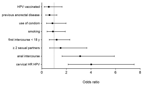 Multivariate analysis of risk factors associated with anal high-risk HPV. HPV—human papilloma virus; y—years; HR—high-risk. Displayed are odds ratios (squares) and 95% confidence intervals (brackets).