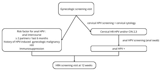 Human Papillomavirus (HPV) is the most common sexually transmitted disease, with an estimated prevalence of 70–80% in women [1]. Furthermore, high-risk (HR) HPV association is seen in 90% of cervical and anal cancers [2]. The pathophysiology of anal and cervical carcinoma, secondary to HPV infection, is quite similar. The cells make contact with the virus when a breach in the cutaneous or mucosal epithelial barrier occurs, leading to exposure [3,4]. Infection spreads with the division of infected cells leading to a wide variety of lesions, influenced by the failure of control mechanisms, including intra-cellular control, a paracrine signaling cascade, and diminished immunological control [5]. Nearly 200 subtypes of HPV have been reported. Among them, 15 predispose people to an increased risk of squamous intraepithelial lesions (SIL) and squamous cell carcinoma [6]. In 90% of cases, the infection is transient and spontaneously resolves [7]. However, high-grade squamous intraepithelial lesions (H-SIL) are unlikely to spontaneously regress [8]. Several risk factors for disease progression, including multiple HPV infections, anal intercourse, immune suppression, human immunodeficiency virus (HIV), smoking, and social deprivation, have been described [9]. While HPV infection has been extensively studied in women with HIV [10], only scarce data are available on general prevalence and risk factors of anal SIL in women [11,12]. Switzerland has been identified as a country with one of the highest age-standardized incidence rates of anal cancer in women [13]. Furthermore, recent data shows an increase on anal cancer incidence in the younger, sexually active population [14].