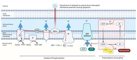 Niclosamide’s action as a mitochondrial uncoupler and protonophore. Mitochondrial membrane depolarization is believed to lead to mitochondrial matrix condensation and subsequent Cytc release, an initiator of apoptosis. Niclosamide also contributes to the generation of reactive oxygen species and activation of AMP-activated protein kinase (AMPK) due to inhibition of ATP synthesis. The accumulation of these effects is believed to be a major mechanism of niclosamide-induced tumor cell death (created with Bio Render) [19,20,21].