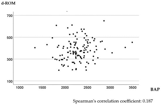 No correlation was found between postoperative d-ROM levels and clinicopathological factors in both the univariate and multivariate analyses (Tables S1 and S2). Similarly, no correlation was observed between postoperative BAP values and clinicopathological factors (Tables S1 and S3). The Spearman’s correlation coefficient analysis of postoperative d-ROM and BAP levels showed a correlation coefficient of 0.279 (p < 0.001), indicating a weak correlation (Figure S1).