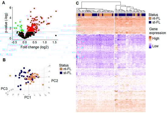 Differentially expressed genes at diagnosis in FL with and without subsequent transformation. (A) Differentially expressed genes between diagnostic nt-FL and st-FL samples. Red, upregulated; green, downregulated. The horizontal line marks p-values of p < 0.05. (B) A 3D PCA plot with input of differentially expressed proteins at p < 0.05 comparing nt-FL and st-FL samples. (C) Hierarchal clustering analysis based on differentially expressed proteins at p < 0.05 comparing nt-FL and st-FL samples. Abbreviations: nt-FL, non-transforming samples; PC, principal component; st-FL, subsequently transforming samples.