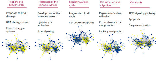 Gene enrichment analysis of significantly differentially expressed genes comparing nt-FL and st-FL samples. Gene enrichment analysis of the set of 164 DEGs comparing nt-FL and st-FL samples. Nodes represent proteins and edges visualize interactions. The depicted groups belong to responses to cellular stress, the immune system, cell cycle signaling, cellular adhesion and migration, and cell death. Yellow indicates proteins involved in the said pathway; blue, proteins are not involved in the pathway.