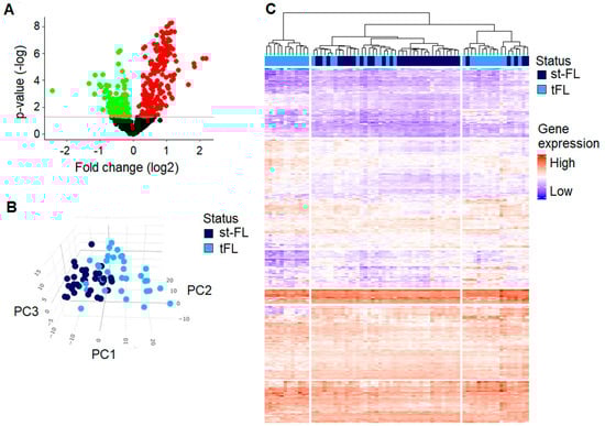 Differentially expressed genes between diagnostic st-FL samples and high-grade tFL samples. (A) Differentially expressed genes between diagnostic st-FL and tFL samples. Red, upregulated; green, downregulated. Horizontal line marks p-values of p < 0.05. (B) A 3D PCA plot with the input of differentially expressed proteins at p < 0.05 comparing st-FL and tFL samples. (C) Hierarchal clustering analysis based on differentially expressed proteins at p < 0.05 comparing nt-FL and tFL samples. Abbreviations: PC, principal component; st-FL, subsequently transforming samples; tFL, transformed FL.