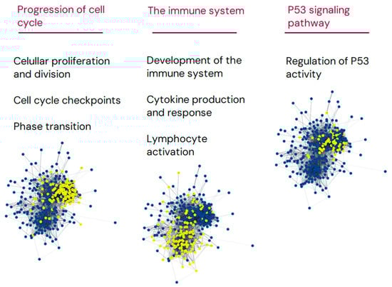 Gene enrichment analysis of significantly differentially expressed genes comparing st-FL and tFL samples. Gene enrichment analysis of the set of 314 DEGs comparing st-FL and tFL samples. Nodes represent proteins and edges visualize interactions. The depicted groups belong to the progression of the cell cycle, processes in the immune system, and P53 signaling. Yellow indicates proteins involved in the said pathway; blue are proteins not involved in the pathway.