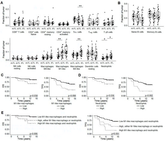 Cellular content of FL/tFL samples according to in silico immunophenotyping. (A,B) Immune cell infiltration in nt-FL, st-FL, and tFL lymphoma samples based on in silico immunophenotyping by CIBERSORTx and NanoString gene expression data. * p < 0.05, ** p < 0.01. (C) Outcome according to M1-like macrophage infiltrates in diagnostic nt-FL and st-FL samples. Left: analysis of overall survival (cutoff fraction 0.0709); right: analysis of transformation-free survival (cutoff fraction 0.0709). (D) Outcome according to neutrophil infiltrates in diagnostic nt-FL and st-FL samples. Left: analysis of overall survival (cutoff fraction 0.0267); right: analysis of transformation-free survival (cutoff fraction 0.0305). (E) Outcome analysis based on numbers of both M1-like macrophages and neutrophils, either one or both, dichotomized based on high and low cutoff from (C,D). Left: analysis of overall survival; right: analysis of transformation-free survival. Abbreviations: NK, natural killer; nt-FL, non-transforming FL; OS, overall survival; st-FL, subsequently transforming FL; TFH, T follicular helper; TFS, transformation-free survival; Treg, T regulatory.