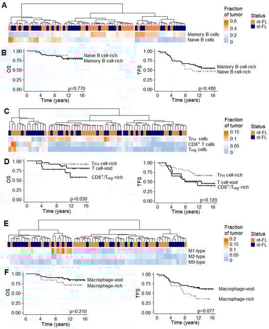 The in silico immunophenotyping hierarchical clustering separated nt-FL and st-FL samples into clusters based on their B cell subsets. The first cluster included patients with higher content of naïve B cells in the lymphoma tissues, while the others encompassed samples with higher contents of memory B cells; however, there were no difference in outcome between naïve-rich or memory-rich groups, as shown in Figure 6A,B. Additionally, clustering separated samples according to the T cell composition, with one group dominated by TFH cells, one group by CD8+ and Treg cells, and a group merely void of T cells, as shown in Figure 6C. The TFH-rich subset was predominated by nt-FL samples. Furthermore, OS and TFS were favorable in the TFH-rich group compared with the CD8+/Treg-rich group (p = 0.030 and p = 0.120, respectively), and they did not differ between the TFH-rich and T cell-void groups, as shown in Figure 6D. Lastly, based on the macrophage content in the lymphomas, two groups were identified. One group, primarily encompassing st-FL samples, had higher proportions of macrophages, while the other was almost void of macrophage subsets, as shown in Figure 6E. Based on these, the group with higher macrophage infiltration was associated with just trending inferior TFS (p = 0.077), as shown in Figure 6F.