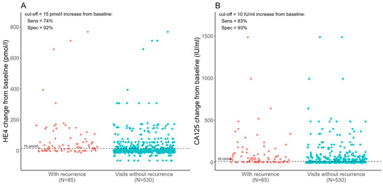 Our analysis indicated that an increase of 10 IU/mL in CA125 level from baseline (marker value when the patient achieved clinical remission) had a sensitivity of 83% and a specificity of 93% in detecting recurrence on average two months before CT scan. In the case of HE4, a 15 pmol/L absolute change from baseline had a sensitivity and specificity of 74% and 92%, respectively, in detecting recurrence 3.3 months before the CT scan (Figure 1).
