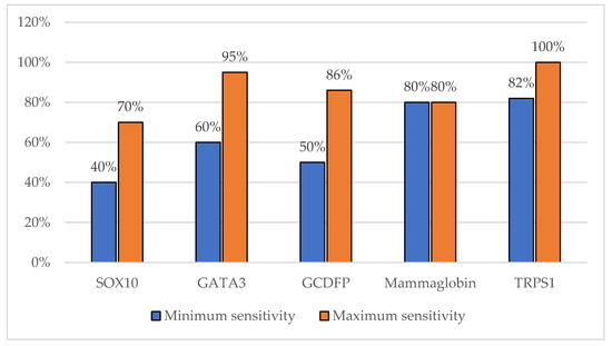 Mammaglobin is often regarded as a specific marker for breast tissue, with a high sensitivity for identifying breast carcinoma. Studies have reported mammaglobin expression in up to 80% of breast cancer cases, especially in luminal-type cancers. However, the expression of mammaglobin tends to be more focal and can be weak in poorly differentiated and triple-negative breast cancers (TNBCs), where its sensitivity significantly decreases. In contrast, TRPS1 has been shown to have a higher sensitivity across all molecular subtypes of breast carcinoma, particularly in TNBC, where TRPS1 is more consistently expressed compared with mammaglobin [19]. A brief comparison of the reported sensitivity of breast carcinoma markers can be found in Figure 1.