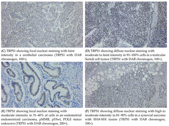 Prostate cancer is one of the most common cancers in men, and its diagnosis often relies on the use of IHC markers such as PSA (prostate-specific antigen) and NKX3.1. However, TRPS1 has been found to be expressed in prostate cancer as well, albeit to a lesser extent than in breast cancer. A recent study by Bachert et al. showed that TRPS1 expression can be observed in up to 31.9% of prostate carcinomas and up to 27.4% of bladder carcinomas [37] (example in Figure 2C). However, only 24.6% of all prostate carcinomas show an intermediate to high expression of TRPS1 [38]. Other studies have shown that an increased expression of TRPS1 is more commonly encountered in patients undergoing androgen withdrawal [38]. Additionally, Van dem Bend et al. demonstrated that LNCaP cells (androgen-responsive cell line that originates from a lymph node metastasis from a prostate carcinoma) that overexpress TRPS1 show a reduction in the expression of androgen-induced PSA in those cells [39]. Other studies have additionally shown that the presence of TRPS1 rs722740 at the TP53 binding site correlates with a more aggressive evolution [40,41]. Lennartz et al. reported the moderate immunoreactivity of TRPS1 in a Sertoli cell tumor of the testis [35].