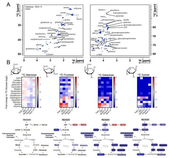 Next, we aimed at assessing how leukaemic cells metabolise different sugars and whether these sugars are substitutable or have different metabolic utilisations. We performed an NMR tracer-based assay using different 13C-labelled sugars in five AML cell lines. Cells were fed with the correspondent 13C-labelled sugar for 24 h, then metabolites were extracted and analysed by NMR spectroscopy. The analysis of the two-dimensional 1H-13C-HSQC spectra using an untargeted approach enabled the assignment and quantification of over 100 signals per spectrum. Figure 2A shows a sample assigned spectrum from Molm13 cells that were fed with 13C galactose.