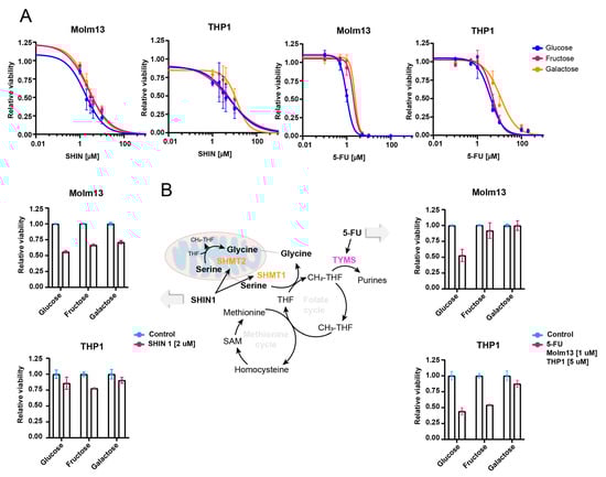 Finally, given the strong shuttling of galactose towards one-carbon metabolism, we aimed at assessing whether cells growing with galactose/fructose would be more resistant to inhibitors targeting the one-carbon metabolism such as 5-Flurouracil (5-FU) and the SHMT1/2 inhibitor SHIN1 [18]. First, we adapted Molm13 and THP1 cells to growing with either glucose, galactose or fructose for 6 days before treatment. Interestingly, we observed lower sensitivity to both inhibitors in cells growing with galactose and fructose compared to those growing with glucose (Figure 4A,B). The pattern was stronger in Molm13 compared to THP1 cells. Although the effect size was not very large, these data further confirm our findings on the role of galactose and fructose in driving the one-carbon metabolism and hence, desensitising cancer cells to inhibitors of this pathway.