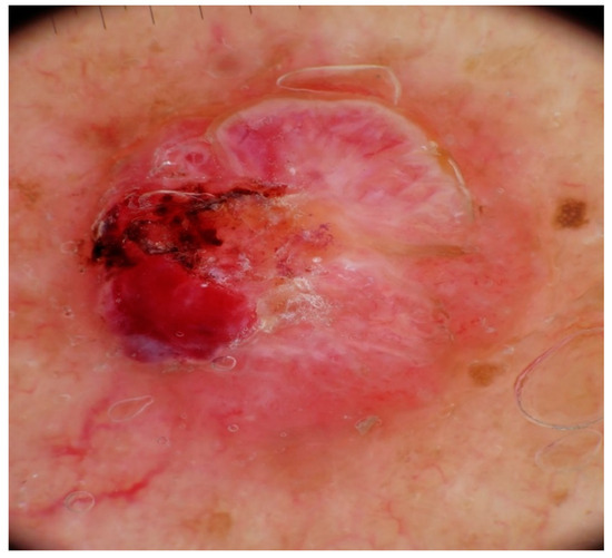 Dermoscopy shows an asymmetric pattern with ulceration, polymorphous vessels, pinkish to cherry-red color, and shiny white structures. Courtesy of Prof. Caterina Longo.