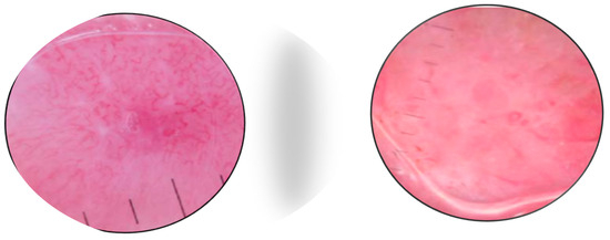 Dermatoscopic examination of MCCs (Figure 3 and Figure 4) typically shows a prominent red color, corresponding to either a dense vascularity or widespread erythema [1]. The most frequently observed dermoscopic features of MCCs are milky red (pink) areas along with some vascular anomalies, as described by Sadeghinia et al. [9]. Pink color was reported in most studies on MCC, either observed as a pink structureless background or as smaller round areas (milky red zones, globules, or clods) [3,9,10,11]. Although pink color can also be found in amelanotic melanoma, a lack of pigmentation or a blue-gray veil point towards a probable MCC [10,11,12,13]. White areas are also commonly reported in MCCs [10]. In terms of vascular pattern, linear irregular vessels, dotted vessels, and a polymorphous vascular pattern have been described [3,9,10,14,15]. However, these structures are present in other tumors as well, such as amelanotic melanoma or poorly differentiated squamous cell carcinoma. Arborizing vessels or branching vessels can also be seen in MCCs, rendering discrimination from BCC plurally challenging [12]. Less frequent dermoscopic features of MCCs are white scales and hyperkeratosis [13].