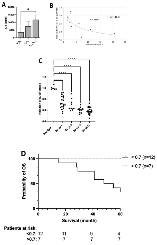 As shown in Figure 4B, a significant correlation was found between the titer of the autoantibodies and the IL-6 serum concentration in these colon cancer patients (p = 0.031). Thus, the serum titer of autoantibodies was inversely correlated with the serum concentration of IL-6 in colon cancer, indicating that a high titer of autoantibodies blocks the activity of IL-6IF.