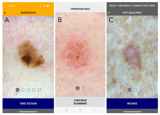 Current DDI-AI device outputs and labeling (Apple iPhone 15 PRO: (A,C); Samsung A14: (B)). (A) SUSPICIOUS (melanoma in situ): Positive (MD3PC) with moderate to high concern for malignancy. Recommended action: Additional evaluation is recommended, as determined appropriate by the medical professional. For a dermatologist, this may be a biopsy, or referral to another dermatologist for a second opinion. If the dermatologist chooses not to biopsy, it is strongly recommended that they document the DDI by uploading the DDI-AI output result to the patient electronic medical record (EMR). For patient safety, in the setting of biopsy avoidance, the DDI-AI recommends the user to complete a DDI spot check follow-up within a 3-month period. The dermatologist should also explain the patient to communicate earlier in the event a change is observed in mole size, shape, or color at any time during the 3-month period. (B) UNREMARKABLE (sebaceous hyperplasia): No immediate concern, limited or no positive MD3PC, with low concern for malignancy. Recommended action: The dermatologist should consider documenting the DDI by uploading the DDI-AI output result to the patient EMR. Recommend a DDI spot check follow-up within a 6-month period. The clinician should also explain the patient to communicate earlier in the event a change is observed in mole size, shape, or color at any time. (C) ERROR (dermatofibroma): The image does not meet DDI-AI technical inclusion criteria and an assessment of the uploaded DDI cannot be made. This result may be returned to the user when the image is not the right sort of item, inadequate immersion oil is used, or when the image quality is insufficient. Recommended action: If an “ERROR” result is obtained, the labeling information explains how to properly retake DDI with a maximum of three attempts per target lesion. If there are three failed consecutive attempts on the same TSLC, DDI-AI labeling instructs the user to not consider the DDI-AI output in their decision-making process and use their independent clinical judgement. Disclaimer: The use of DDI-AI is not intended to issue a final diagnosis and is not a total body mole scanner.