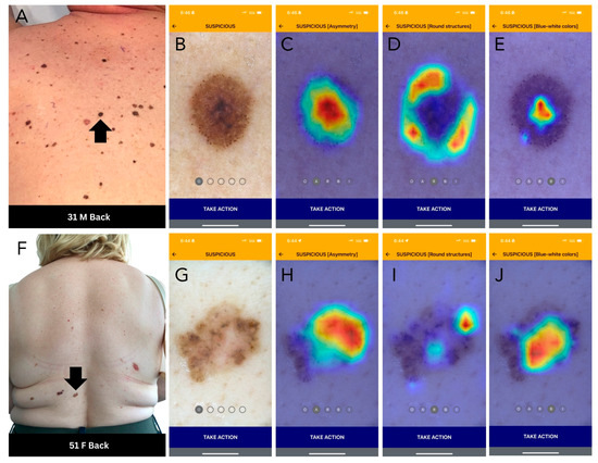 DDI-AI device outputs. (A) Clinical image of a melanoma (black arrow). (B) DDI-AI device suspicious output. (C–E) DDI-AI device transparent heatmap outputs based on the possible presence of modified dermoscopy three-point checklist criteria (MD3PC), presented individually to the user. (F) Clinical image of a basal cell carcinoma (black arrow). (G) DDI-AI device suspicious output. (H–J) DDI-AI device transparent heatmap outputs.