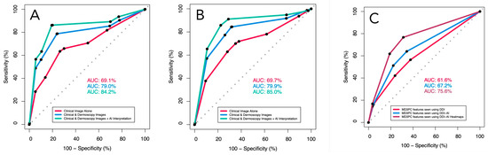 The receiver operator characteristics (ROC) for dermatologist (A) diagnostic sensitivity and specificity, (B) management sensitivity and specificity, both adjusted for participant confidence in their decision (none, slight, moderate, high), and (C) MD3PC-specific features for detecting malignancy. Red line (dermatologists using DDI evaluated with clinical experience), blue line (same dermatologists using the DDI-AI device output), and green line (dermatologists using the DDI-AI heatmaps).