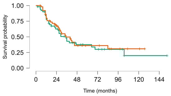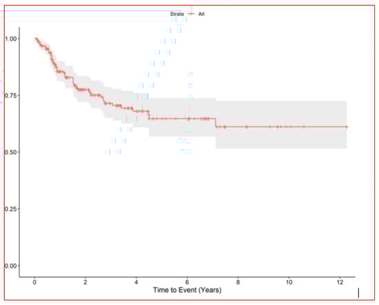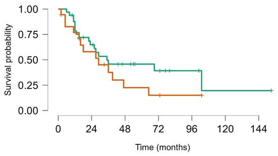 On 31 December 2023, there had been 60 deaths; among the 40 survivors, 22 were alive with disease and 20 were alive without disease. Overall, median survival from first LM appearance or progression was 4.8 years (95% CI, 4.1–7.5); for BS and STS, median survival was 5.7 years (95% CI, 4.1–8.9) and 4.8 years (95% CI, 4.1–9.9), respectively. The 5-year OS for all groups from first metastasis or from metastatic progression (if LM already present) was 49% (95% CI, 39–60); for BS and STS, the 5-year OS was 52% (95% CI, 39–69%) and 46% (95% CI, 33–63%), respectively (no statistically significant difference. No statistically significant difference in objective response and overal survival from first LM was noted between STS and BS p value = 0.63 (Figure 4). As well as inside BS no statistically significant Objective Response and Overall Survival was noted between Ewing sarcoma (18 pts) and other bone sarcomas (33 pts) p-value log-rank test 0.24 (Figure 5). We did not observe any difference in local control of LM according to different techniques, but in more recent years, the use of DIBH (deep inspiration breath hold) allowed, when possible, for the easier reduction of the total dose of radiation to the lungs, especially in patients with multiple lesions.